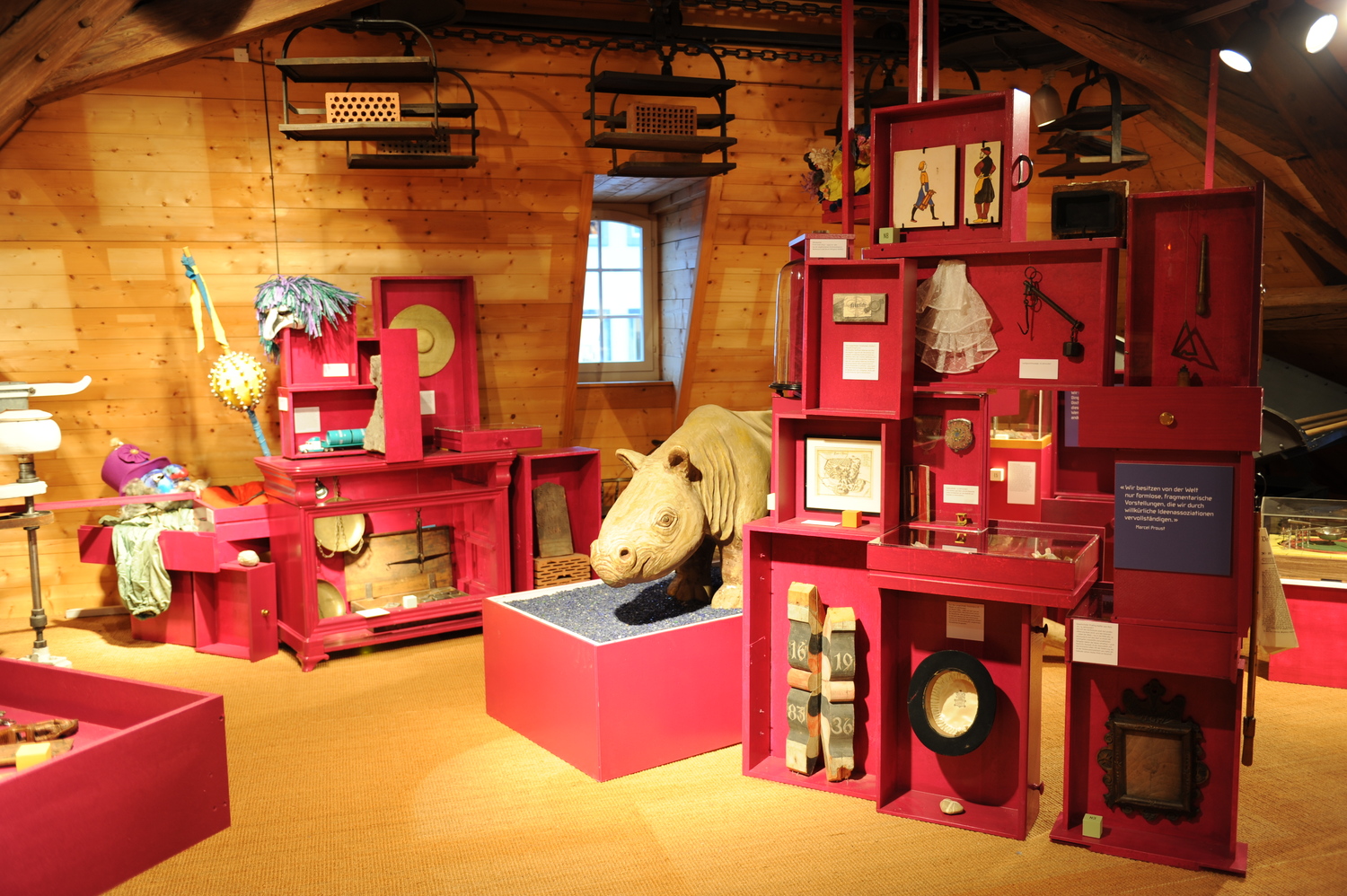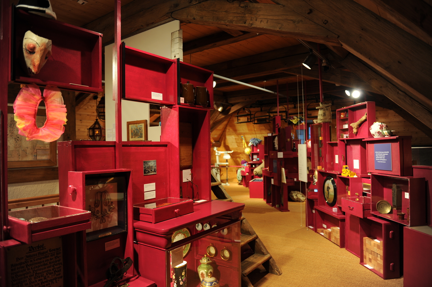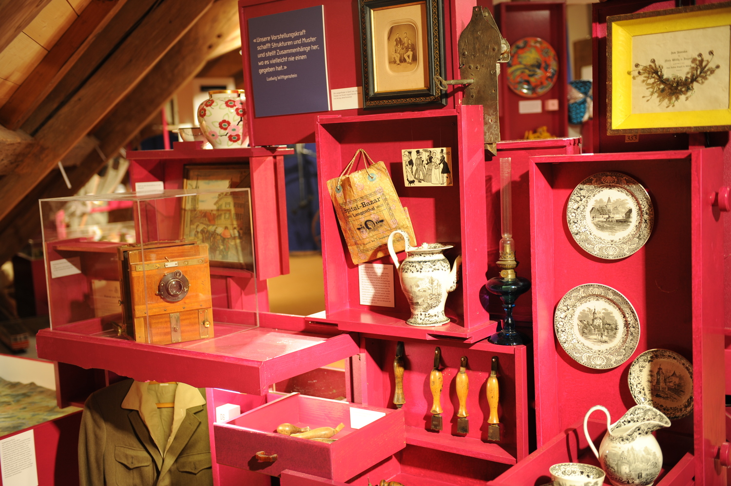 Anordnung der Dinge– Die Ausstellung zu Langenthal, dem Oberaargau und der WeltEine Ausstellung ist immer auch ein Kunstgriff: Durch den purpurnen Schrank betreten wir, wie durch eine magische Tür, eine Art „Erinnerungsraum“. Hier im Dachgeschoss herrscht eine andere Zeit. Sie steht jedoch nicht still, im Gegenteil. Die Ausstellung wurde am 7. Dezember 2011 feierlich eröffnet. |